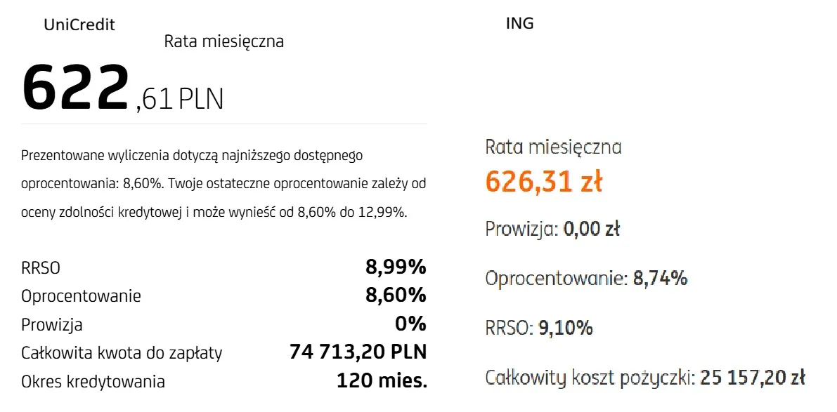 Porównanie kosztów kredytu gotówkowego w UniCredit i ING na dzień 24.02.2026 r.