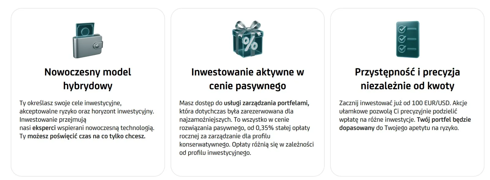 Bank pobiera prowizję za zarządzanie portfelem. Jest naliczana codziennie, pobierana miesięcznie. Jej wysokość zależy od poziomu ryzyka i jest wyrażona w skali roku.