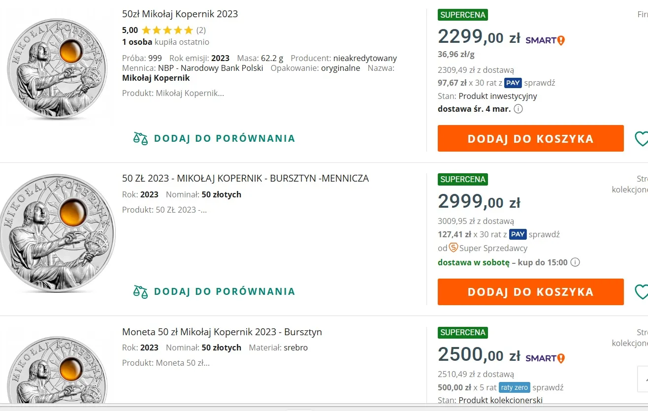 Ceny srebrnej monety 50 zł z 2023 r. „Mikołaj Kopernik” na dzień 02.03,2026 r., źródło: www.allegro.pl