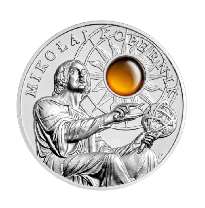 6. Srebrna moneta 50 zł „Mikołaj Kopernik” z 2023 r. z bursztynową wstawką